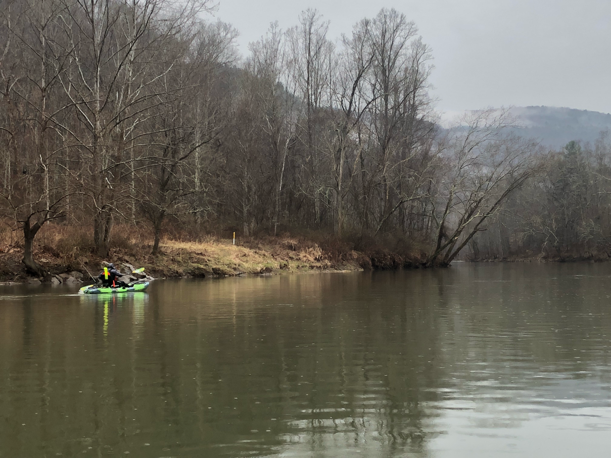Greg and I headed out to the Bluestone River on our first outing of 2018. The water was high and moving to quick to pick apart the areas we had came to target. As soon as we arrived the rain started. Greg hook a big musky on a tube with his third cast not even 10 yards from where we parked. I started paddling towards him and even took a picture of him fighting it. I got the musky in the net and as soon as I did the jig fell out of his mouth. The musky continued to flop around and I put the slimy thing in a head lock. I held it while Greg attempted to put the fish grippers on it. In the process of doing that he dropped a box of tackle that he had to go chase down. He got it back and go the grippers on it. He held it up for me to take a picture but there was so much fish slime on my hands that I could not get my iPhone to take a picture. I wiped my phone up and raised the camera to take a picture right as the musky went nuts and flopped into the water. As it fell into the water the fish grippers hit the boat gunnel and came off. The muskies back dorsal fin got sheered off as the went back into the water leaving us with only a keepsake of the experience. We fished two more hours with no hits or fish to speak of. Today was a warm up to start the 2018 season but you can really see we have gotten rusty over the winter. Why we did not take the musky to the bank for pictures which is standard operating procedure when dealing with muskies in a kayak remains a mystery.
